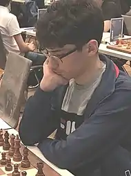 Firouzja won the Iranian Chess Championship for a second time in 2019, finishing clear first with 9/11 (+7−0=4).[21] In March, he competed in the World Team Chess Championship with Iran. He scored 7/9 points (+6−1=2) as Iran placed sixth out of ten.[22] Later in March, he participated in the 3rd Sharjah Masters. He tied for 1st–7th on 7/9 (+5−0=4), placing fourth on tiebreak. Ernesto Inarkiev won the event.[23] In April, Firouzja competed in the Chess.com Bullet Chess Championship, losing in the quarterfinals to the eventual winner Hikaru Nakamura.[24] Later in April, Firouzja placed second on tiebreak behind Constantin Lupulescu in the Reykjavik Open with 7/9 (+6−1=2). During the event's rest day, he won the European Fischer Random Championship with 8/9 (+7−0=2).[25]