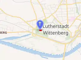 All Saints' Church, commonly referred to as Schlosskirche (Castle Church) to distinguish it from the Stadtkirche (Town Church) of St. Mary's – and sometimes known as the Reformation Memorial Church – is a Lutheran church in Wittenberg, Saxony-Anhalt, Germany. It is the site where, according to Philip Melanchthon, the Ninety-five Theses were posted by Martin Luther in 1517,[1] the act that has been called the start of the Protestant Reformation.[2][3] From 1883 onwards, the church was restored as a memorial site[4][5][6] and re-inaugurated on 31 October 1892, 375 years after Luther's posting.