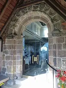 The tower at the west end, dating from the 16th century, is built of red and buff sandstone in Perpendicular style. On the south face of the tower are carved a chalice and the initials "I. B.".[1] These initials are those of the parish priest of the time, John Bybber,[3] or Byber.[4] The bell openings contain Y-tracery. On each side of the church are two lunette windows, with two round-headed windows between them. At the east end of the church is a Venetian window.[7] A Norman doorway which survived the fire has been reset in the south wall of the nave.[8]