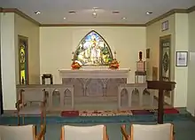 On the north wall of the sanctuary, above the narthex is a Rose Window. On the west wall are five stained glass windows depicting St. Mary, St. Andrew, St. Alban, St. Athanasius, and St. Francis. On the east wall are four stained glass windows depicting St. Joan of Arc, William Tyndale, Samuel Seabury, and John Coleridge Patteson.