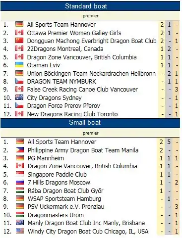 - "Results European Dragon Boat Federation EDBF". Archived from the original on 2013-07-19. Retrieved 2013-07-14.