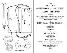 - Hume, A. (1874). The Indian Ornithological Collector's Vade Mecum: containing brief practical instructions for collecting, preserving, packing and keeping specimens of birds, eggs, nests, feathers, and skeleton. Calcutta Central Press, Calcutta and Bernard Quaritch, London.