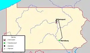 The Martin 2-0-2 operating the flight departed Harrisburg with 26 passengers and crew on board and crashed while maneuvering to land at Williamsport Regional Airport in poor weather. A passenger was the lone survivor. Of the 26 passengers and crew many came from Pennsylvania or other Mid-Atlantic states, however there were two foreign nationals on board: one from France and the other from Lithuania.