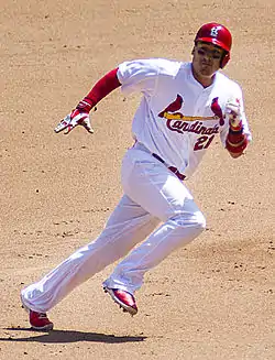 Through September 16, he showed that he was adept at hitting with runners in scoring position with a .355 batting average in his 197 career at-bats.[21] Craig fabricated consistency throughout the season, finishing with a .307 average, 22 HR and 92 RBI in 119 games. He ranked tenth in the NL in batting, seventh in slugging percentage (.522) and placed 19th in the Most Valuable Player award (MVP) balloting.[11] He also led all major leaguers with a .400 batting average with runners in scoring position (RISP).[20] Despite two DL trips, Craig played 30 games in the outfield and led the team in starts at first base with 86, while Berkman appeared in just 32 total games.[27]