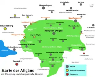 The alpine regions of the Allgäu rise over 2,000 metres in altitude and are popular for winter skiing. The Allgovian area is notable for its beautiful landscapes and is popular for vacations and therapeutic stays.[1] It is well known in Germany for its farm produce, especially dairy products including Hirtenkäse ("herdsman's cheese") and Bergkäse ("mountain cheese").
