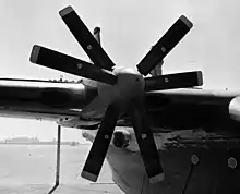 Accessories included a Master Control Unit, mounted above the compressors, and an air driven starter on the gearbox. The compound reduction gear had an overall reduction ratio of 15.75:1 and incorporated an airscrew brake to prevent windmilling when the engine was stopped. Anti-icing for the air intakes was supplied by compressor bleed air. The contra-rotating propeller consisted of two 14 ft (4.3 m) three-bladed Aeroproducts propellers fitted to concentric shafts.[1]
