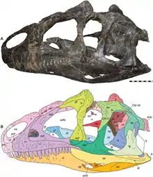 Inside the lacrimal bones were depressions that may have held glands, such as salt glands.[20] Within the maxillae were sinuses that were better developed than those of more basal theropods such as Ceratosaurus and Marshosaurus; they may have been related to the sense of smell, perhaps holding something like Jacobson's organs. The roof of the braincase was thin, perhaps to improve thermoregulation for the brain.[7] The skull and lower jaws had joints that permitted motion within these units. In the lower jaws, the bones of the front and back halves loosely articulated, permitting the jaws to bow outward and increasing the animal's gape.[21] The braincase and frontals may also have had a joint.[7]