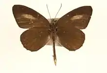 Female. Similar, but in all specimens I have seen invariably smaller. Underside: ground colour of the same brown shade as in the male, the pale postcellular patch on forewing replaced by a diffuse medial patch that spreads into the cell. Hindwing: as in the male. Underside: also similar in ground colour and markings to that of the male, but the markings broader, more clearly defined, and less macular. Antenna, head, thorax and abdomen as in the male.[5]