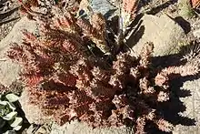 Aloe juvenna has many short, straight, compact triangular leaves, which are densely packed all along the stems. It is common in cultivation but extremely rare in habitat. Aloe juvenna is also a tetraploid, with a double set of chromosomes (28, instead of 14) and, in appearance, does not resemble any other Aloe species from the region.[4][5]