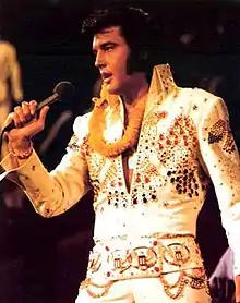 Presley then approached his costume designer, Bill Belew with an idea for his concert suit. Belew started to work for Presley in 1968, with the creation of the leather suit he used on his NBC special Elvis. Belew then continued his collaboration by creating the one-piece jumpsuits the singer wore during his appearances in Las Vegas. Belew's designs featured gabardine stretch fabric with Napoleonic collars, rhinestone decorations and bell-bottoms.[30] For the upcoming special, Presley requested Below to create a patriotic design.[30] Presley felt that the broadcast of the show via satellite was a product of American creative thinking,[31] and that since it was going to be broadcast to foreign countries, he told Belew "I just want the suit to say America".[32] It was one of three times Presley had a special request for the designer, as Belew usually relayed on his original creativity.[30] Initially, the designer suggested a pattern based on the outline of the map. They then considered the flag, but settled for the bald eagle, since Belew recalled seeing it in an US embassy.[33] The white jumpsuit then featured the bald eagle made out with patterns of gold, blue and red gems in the chest and back.[31][27] Belew created a four-inch white leather belt featuring five ovals with the Great Seal of the United States.[30] A calf-length cape was initially made for Presley. He planned at the start of his performance to be covered by it, and then to reveal himself as the show started. Presley discarded to use the 12 pounds (5.4 kg) cape during the rehearsals, as he felt it was too heavy.[34] Belew created then a hip-length cape.[31] The making of the entire costume required most of Belew's staff due to the amount of embroidery and the attachment of several pieces of jewelry involved.[30] It featured 6,500 individual stones.[28]