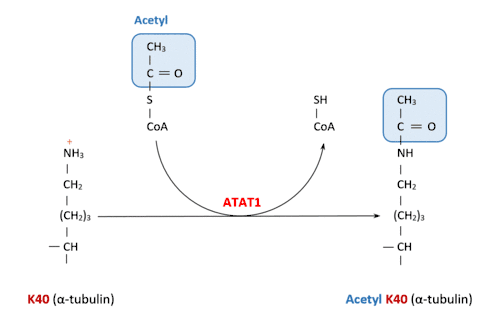 ATAT1 specifically acetylates ‘Lys-40’ in alpha tubulin on the lumenal side of microtubules. This is the only known posttranslational modification in the microtubule lumen, but it is still unknown how does the enzyme access the lumen.[8]