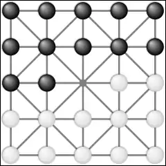 Before starting, each player places their twelve pieces in the two rows closest to them and in the two rightmost spaces in the center row. The game is played in turns, with one player taking white and the other black.