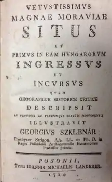 In 1784, Juraj Sklenár, a Slovak historian and teacher of rhetoric in Pressburg (today's Bratislava), published Vetustissumus magnae Moravie situs et primus in eam Hungarorum ingressus et incursus (English: The oldest location of Great Moravia and the first invasion and the arrival of the Hungarians into it). His work had a political purpose and character.[38] He argued that the Magyars never conquered the territory inhabited by the Slovaks and the latter voluntarily joined the Kingdom of Hungary during the rule of Ladislaus I of Hungary.[39][38]