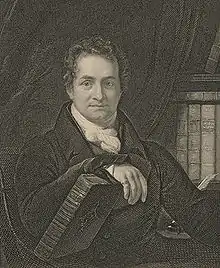 John's son George John, 2nd Earl Spencer inherited Althorp after his father's death in 1783. He served as Whig MP for Northampton from 1780 to 1782 and for Surrey from 1782 to 1783 before accepting the title of 2nd Earl Spencer. He was later Home Secretary from 1806 to 1807 under Lord Grenville in the Ministry of All the Talents. Extremely interested in literary pursuits, he developed one of the largest private libraries in Europe at Althorp.[6] He was the instigator and first President of the Roxburghe Club (an exclusive bibliophilic club), founded in 1812, President of the Royal Institution from 1813 to 1827,[32] and Commissioner of the Public Records in 1831, among other literary pursuits.[33] In later life, his collecting habit had become an obsession, and he attempted to collect every volume ever published in Britain.[6] Such was his desire to obtain as complete a collection as possible, that when Napoleon instigated the secularisation of religious houses in south Germany, Spencer used the local British agent and Benedictine monk, Alexander Horn to acquire many of their rare books and manuscripts.[34] Althorp became a major cultural hub of England during his time; at one Christmas, the actor David Garrick, the historian Edward Gibbon, the playwright Richard Brinsley Sheridan and the painter Joshua Reynolds, among other artistic figures. attended a party there together.[35] However, George John's spending became problematic for the Spencers, especially as at the time they were feeling the impact of the agricultural depressions brought on by the Napoleonic Wars. By the time of his death in 1834 he had amassed a debt of £500,000, which he passed onto his son, John Spencer, 3rd Earl Spencer.[35]