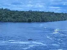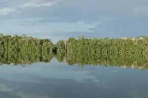 The Alto Rio Negro Indigenous Territory is in the Amazon biome.[1] The territory has blackwater rivers with low levels of fish, sandy and relatively infertile soil.[7] The lack of nutrients in the waters of the Rio Negro and its tributaries means that the fish obtain most of their diet from organic matter from the margin of the river, including insects, fruits, flowers and seeds. Although there are some large species, there are many smaller species, each with low numbers of individuals.[14]