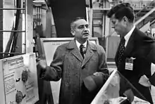 This Homogeneous Reactor Experiment (HRE) was affectionately dubbed "Alvin's 3P reactor" because it required a pot, a pipe, and a pump. The HRE went into operation in 1950 and, at the criticality party, Weinberg brought the appropriate spirits: "When piles go critical in Chicago, we celebrate with wine. When piles go critical in Tennessee, we celebrate with Jack Daniel's."[25] The HRE operated for 105 days before it was closed down. Despite its leaks and corrosion, valuable information was gained from its operation and it proved a simple and safe reactor to control.[34] During the time the HRE was online, Senators John F. Kennedy and Albert Gore, Sr. visited ORNL and were hosted by Weinberg.[25]
