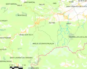 Amélie-les-Bains-Palalda is located in the canton of Le Canigou and in the arrondissement of Céret. It sits at the confluence of the Mondony with the Tech, 28.5 miles (46 km) SSW of Perpignan by road. The town is situated at a height of 770 feet (230 m) and has both a winter and summer season.[2]