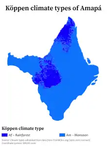 Amapá has an equatorial climate, a tropical climate with no dry season. In the Köppen climate classification, it has a Tropical Monsoon climate, Am. Tropical rainforest is the natural vegetation.