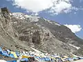 Tents are available to hire for a small fee near base of imposing Amarnath Cave as visible in background