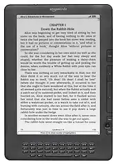 The device featured a six-inch (diagonal) four-level grayscale E Ink display, with 250 MB of internal storage, which can hold approximately 200 non-illustrated titles.[15] It also has a speaker and a headphone jack for listening to audio files.[12] It has expandable storage via an SD card slot. Content was available from Amazon via the Sprint Corporation US-wide EVDO 3G data network, via a dedicated connection protocol which Amazon called Whispernet.[15] Amazon did not sell the first-generation Kindle outside of the US.[15]