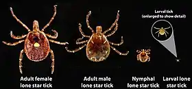 The tick follows the normal developmental stages of egg, larva, nymph, and adult. It is known as a three-host tick, meaning that it feeds from a different host during each of the larval, nymphal, and adult stages. The lone star tick attaches itself to a host by way of questing.[11] The eggs are laid on the ground, hatch, and the larvae wait for or actively seek a host (questing behavior). A larva feeds, detaches from its host, molts into a nymph when on the ground, and quests by crawling on the ground or waiting on vegetation. The nymph feeds and repeats the same process as the larva, but emerges having developed the anatomy of either an adult female or male. Adults quest similarly to nymphs. The female attaches only to a species of host for reproduction. The female engorges on much blood, expanding greatly, then detaches and converts the blood meal into eggs, which are laid on the ground. Females of large species of Amblyomma engorge to a weight of 5 g and lay 20,000 eggs. The female dies after this single egg-laying. The male takes repeated small meals of blood and attempts to mate repeatedly whilst on the same host. Feeding times for larvae last 4–7 days, nymphs for 5–10 days, and adults for 8 to 20 days. The time spent molting and questing off the host can occupy the remainder of 6 to 18 months for a single tick to complete its lifecycle. The lifecycle timing is often expanded by diapause (delayed or inactivated development or activity) in adaptation to seasonal variation of moisture and heat. Ticks are highly adapted for long-term survival off the host without feeding and can extract moisture directly from humid air. However, survival is greatly reduced by excess heat, dryness, and lack of suitable hosts to which to attach. Survival on the host is also greatly reduced by grooming and by hypersensitive immune reactions in the skin against the feeding of the ticks.[12]