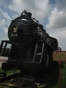 Amboy Illinois Central Depot has a static steam locomotive display on its property, the locomotive sits on unconnected railroad tracks adjacent the Depot. The locomotive is an 0-8-0 steam engine built in 1929 by Baldwin Locomotive Works as a switcher bearing the number 8376. It was originally operated by the Grand Trunk Western Railroad. Switcher #8376 (8376) was retired from service near Detroit, Michigan, in 1958 and sold as scrap. The now-defunct Northwestern Steel and Wire company, in Sterling, Illinois, ended up with 8376 and other steam locomotives, and instead of melting them down the company renovated them. The company then used them to replace their aging internal locomotives, used within the steel mill grounds. Thus, 8376 was brought out of storage and recommissioned in 1976 as NS&W #76. When it was christened, NS&W #76 (76) was the last steam locomotive engine to be commissioned for regular freight service in the United States. 76 operated in daily service until the mill owner's death in 1980, it was retired shortly after and obtained by the Amboy Depot Commission.[9]