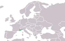 Ambrosi's cave salamander is endemic to a small area of southeastern France and northwestern Italy. Despite its name, it is not restricted to caves though it retreats under stones, logs and into caverns in dry periods. At other times it is active on the leaf litter near streams and on wet rocky outcrops in wooded valleys at altitudes of up to 1,250 metres (4,100 ft). In the southeast of its distribution, where its range overlaps that of the Italian cave salamander (Speleomantes italicus), the two species sometimes hybridise.[2]