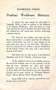 As a PLG Scott not only regularly inspected the workhouse premises at Pembury but also visited people for whom the Union was responsible including those who had been sent to the County Asylum at Barming, near Maidstone. She served on the Union’s Finance Committee as well as the Children’s Committee, the House Committee and the Mental Deficiency Committee. Her career as a PLG continued until 1930 when the Board’s functions were transferred to the Kent County Council’s Public Assistance Committee. According to a semi-autobiographical work about the ending of the Poor Law entitled The Passing of a Great Dread, Scott learnt a great deal from her experience as a PLG, not least from her dealings with a female vagrant to whom she gave the pseudonym ‘Elspeth’.[7] Her Poor Law work also opened her eyes to the needs of new mothers, both married, and unmarried; as well as those of young, sick and elderly workhouse inmates. Among the service improvements she championed was the construction of a proper mortuary, complete with space for the grieving relatives of the deceased.