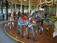 It's a Deluxe Menagerie model 3-Row Carousel. It has 43 horses, with 12 elaborately carved outside row standing horses and 31 jumping horses. There are five menagerie figures, a lion, a tiger a deer, a giraffe, and a rare mule. Many of the jumpers were carved by Daniel Muller.[1]