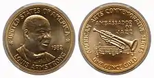 | 1982 | 1 troy ounce (31 g) | Portrait of Louis Armstrong | UNITED STATES OF AMERICA – 1982 – LOUIS ARMSTRONG | Trumpet and musical notes | AMERICAN ARTS COMMEMORATIVE SERIES – AMBASSADOR OF JAZZ – ONE OUNCE GOLD | John Mercanti | 420,000 | 409,098 |