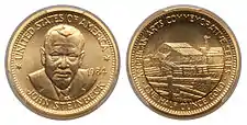 Production began in 1980.[8] Struck at the West Point Bullion Depository, the medallions contained 90% gold, and were issued in two sizes: one containing one troy ounce (31 g) of gold and one containing one half-ounce (16 g) of the metal.[9] The first struck were those honoring Grant Wood on the one ounce medallion and Marian Anderson on the half-ounce piece.[9] Both were designed by United States Mint Chief Engraver Frank Gasparro.[9] Sales were poor, and in September 1980, the Mint announced that a private firm, commodity traders J. Aron and Company, would market the medallions.[10] The new plan involved selling the medallions through a network of bullion dealers, banks, brokerage houses and coin dealers,[10] a system similar to that South Africa used to distribute the Krugerrand in the US.[11] In 1981, the second year of production, the composition of the medallions was changed; although the 90% gold purity was retained, the balance was altered to include silver, which was added to change their appearance.[12] That year's medallions depicted Mark Twain and Willa Cather. These were designed by Matthew Poloso and Sherl Winter, respectively.[13] These first four medallions bore no notation of their metallic content or country of origin. This was done to distinguish them from federal coinage.[9] Beginning in 1982, this information and small, toothlike designs, known as "denticles", were added along the inner rim of the medallions, and reeding was added to the edge.[8] That year's issues depicted Louis Armstrong, as designed by John Mercanti, and Frank Lloyd Wright, designed by Edgar Steever.[13] The following year's medallions depicted Robert Frost and Alexander Calder. The former was designed by P. Fowler, while the latter was by Michael Iacocca.[14] The final year of production saw the mintage of medallions with designs by John Mercanti honoring Helen Hayes and John Steinbeck.[14] The Mint terminated the contract with J. Aron and Company in 1984,[11] opting instead to sell the medallions through a telemarketing program.[11] In 1985, Mint director Donna Pope announced that the medallions would be sold in another telemarketing operation in sets of five of either one each of the one ounce medallions or one each of the half-ounce pieces, beginning in September of that year and ending on December 31, or sooner if all sets sold.[15]