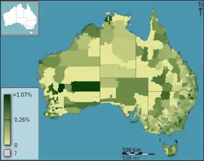 At the 2006 Australian Census, 71,718 Australian residents declared that they were American-born. Concentrations of American-born residents were in Sydney (16,339), Melbourne (11,130), Brisbane (6,057), Perth (5,558), Adelaide (2,862), and Canberra (1,970).[2] Also at the census, residents could nominate up to two ancestries; 56,283 respondents declared they had American ancestry with 3,901 who declared Hispanic ancestry, 1,798 declared an African American ancestry, 3,936 declared a native North American Indian ancestry and 224 declared Puerto Rican ancestry.[3]