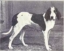 In 1650, Robert Brooke sailed from England to Maryland with his pack of hunting dogs, which were the root of several strains of American hounds. Dogs of this bloodline, known as "Brooke Hounds," remained in the Brooke family for nearly 300 years, possibly one of the longest documented breeding records for a single breed and family.[1] George Washington received French Foxhounds, Grand Bleu de Gascogne, (which look much like an American Bluetick Coonhound) as a gift from the Marquis de Lafayette. Many of the dogs Washington kept were descended from Brooke's, and when crossed with the French hounds, helped to create the present-day American Foxhound. The American Foxhound is known to have originated in the states of Maryland and Virginia, and is the state dog of Virginia.[2] Though there has long been a rumor that the new breed was originally used for hunting Indigenous peoples of the Americas, this is not true. The breed was developed by landed gentry purely for the sport of hunting foxes. With the importation (or migration) of the red fox, Irish Foxhounds were added to the lines, to increase speed and stamina in the dog, qualities still prevalent in today's dogs. One quality that the American Foxhound is famous for is its musical bay that can be heard for miles. This is actually one reason why this breed does not do well in city settings. The breed was first recognized by the American Kennel Club in 1886. Today, there are many different strains of American Foxhound, including Walker, Calhoun, Goodman, Trigg, July and Penn-Marydel. Though each strain looks different, they are all recognized as members of the same breed. Most show hounds are Walkers, many of the pack hounds (used with hunting foxes on horseback) are Penn-Marydel and hunters use a variety of strains to suit their hunting style and quarry.