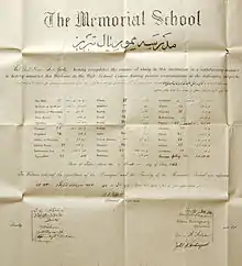 American Memorial School of Tabriz (مدرسه مموریال آمریکایی تبریز), established in Tabriz in 1881 during the Qajar Empire, is one of the most prominent schools of its kind. Hundreds of Iranian received their secondary education in Memorial School. In 1935-1936 following the order of Reza Shah Pahlavi to nationalize all of the private schools, the school was renamed Parvin High School (دبیرستان پروین)[1] by Iran's Ministry of Education. At present this school is divided into three separate secondary schools; however, the main original building still remains, as part of Parvin School.