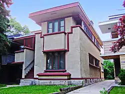 The American System-Built Homes were modest houses designed by architect Frank Lloyd Wright. They were developed between 1912 and 1916 to fulfill his interest in affordable housing. Wright was devoted to the idea of providing beautiful yet affordable homes to the public. His firm produced over 960 drawings for the project, the largest number of drawings for any project in the Wright archives.[2] The designs were standardized, and customers could choose from seven models. Because of this standardization, the lumber could be precut at the factory, thereby cutting down on both waste and the amount of skilled labor needed for construction.[3] The buildings are often termed prefabricated homes, but they were not, since no parts of the homes were constructed off-site. The lumber was cut at the factory, packaged along with all other components, and delivered to the work site for construction.[4] Some are located in a federal historic district in Milwaukee, Wisconsin, and others have been designated Chicago Landmarks in Chicago, Illinois.