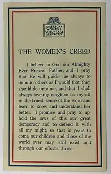 American Women's Voluntary Services (AWVS) was the largest American women's service organization in the United States during World War II (WWII).[1] AWVS provided women volunteers who provided support services to help the nation during the war such as message delivery, ambulance driving, selling war bonds, emergency kitchens, cycle corps drivers, dog-sled teamsters, aircraft spotters, navigation, aerial photography, fighting fires, truck driving, and canteen workers. Some of its work overlapped with the Office of Civilian Defense and the American Red Cross.[2]