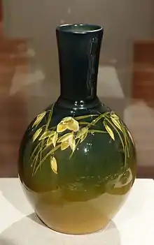 American art pottery (sometimes capitalized) refers to aesthetically distinctive hand-made ceramics in earthenware and stoneware from the period 1870-1950s. Ranging from tall vases to tiles, the work features original designs, simplified shapes, and experimental glazes and painting techniques. Stylistically, most of this work is affiliated with the modernizing Arts and Crafts (1880-1910), Art Nouveau (1890–1910), or Art Deco (1920s) movements, and also European art pottery.