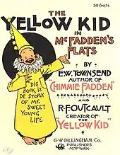 The G. W. Dillingham Company published the first known proto-comic-book magazine in the US, The Yellow Kid in McFadden's Flats, in 1897. A hardcover book, it reprinted material—primarily the October 18, 1896, to January 10, 1897, sequence titled "McFadden's Row of Flats"—from cartoonist Richard F. Outcault's newspaper comic strip Hogan's Alley, starring the Yellow Kid. The 196-page, square-bound, black-and-white publication, which also includes introductory text by E. W. Townsend, measured 5 by 7 inches (130 mm × 180 mm) and sold for 50 cents. The neologism "comic book" appears on the back cover.[10] Despite the publication of a series of related Hearst comics soon afterward,[10] the first monthly proto-comic book, Embee Distributing Company's Comic Monthly, did not appear until 1922. Produced in an 8 1⁄2-by-9-inch (220 mm × 230 mm) format, it reprinted black-and-white newspaper comic strips and lasted a year.[10][11]