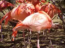 One of the most distinctive attribute of P. ruber is its unipedal stance, or the tendency to stand on one leg. While the purpose of this iconic posture remains ultimately unanswered, strong evidence supports its function in regulating body temperature.[38] Like most birds, the largest amount of heat is lost through the legs and feet;[38] having long legs can be a major disadvantage when temperatures fall and heat retention is most important. By holding one leg up against the ventral surface of the body, the flamingo lowers the surface area by which heat exits the body.[37] Moreover, it has been observed that during periods of increased temperatures such as mid-day, flamingos will stand on both legs. Holding a bipedal stance multiplies the amount of heat lost from the legs and further regulates body temperature.[38]