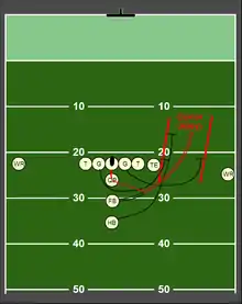 This play resembles a sweep, but before the running back crosses the line of scrimmage, he hands the ball off to a wide receiver going in them reverse (opposite) direction of where the running back was going. If the defense was drawn to the side of the field the running back was going towards, the receiver can outrun the defense to the other side of the field and make a big gain.