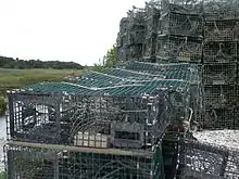 Lobster traps are rectangular cages made of vinyl-coated galvanized steel mesh or wood, with woven mesh entrances. These are baited and lowered to the sea floor. They allow a lobster to enter, but make it difficult for the larger specimens to turn around and exit. This allows the creatures to be captured alive. The traps, sometimes referred to as "pots", have a buoy floating on the surface, and lobstermen check their traps between one and seven days after setting them. The inefficiency of the trapping system has inadvertently prevented the lobster population from being overfished. Lobsters can easily escape the trap, and will defend the trap against other lobsters because it is a source of food. An estimated 10% of lobsters that encounter a trap enter, and of those that enter 6% will be caught.[63]