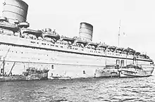 The majority of troops travelled across the Atlantic on ocean liners like the RMS Queen Elizabeth and Queen Mary. Making three round-trip voyages per month carrying up to 15,000 passengers each time, these two liners alone carried 24 percent of troop arrivals. They were supplemented by other liners, including the RMS Aquitania and Mauretania, and the SS Île de France, Nieuw Amsterdam and Bergensfjord, which accounted for another 36 percent.[24] The troops debarked into ship's tenders, and boarded quayside trains to their destinations.[23]