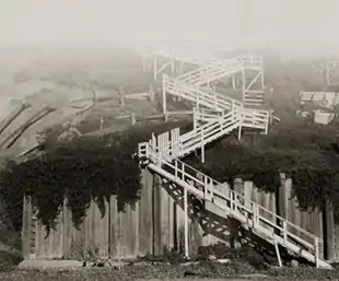 The "Time Moves Still" works (2011–3)[69] explore instability, pliability and resistance, pairing images of "discordant amalgamations of geology, civil engineering, and residential construction" lining cliffsides with studies of "hobbled though strangely beguiling urban trees."[70][71][72] The cliff series (e.g., Coastline Cliffside_08, 2012) uses long exposures that harken to early photography, compositing dozens of sequenced image-captures into seemingly instantaneous photographs that nonetheless yield clues to their extended temporality.[71][70] Los Angeles Times critic Holly Myers called them "stately, often elegant photographs" that uncover "the peculiar, the precarious, the buoyant, and the beautiful" in structures often overlooked.[70]