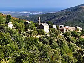Ampriani is a commune on the eastern side of Corsica in the heart of the Pieve (religious jurisdiction) in the Serra in the canton of Moita Verde. It is 30 km by road north-west from Aleria and significantly less in a direct line and 16 km south-west of Moïta in the Valley of the Cursigliese. Access is by the D116 road from Tallone in the south-east which continues north of the village north-west to Zuani. Ampriani is a small village of a single row of houses with a watchtower aligned on a ridge at an altitude of about 600 metres (lowest point 320 m, highest point: 749 m) overlooking the valley and almost the entire plain. The village is nearly deserted in winter, but has about a hundred people in summer. The road leading to the village is a dead end and ends on the old "helicopter pad". The terrain in the commune is rugged and heavily forested.[2]