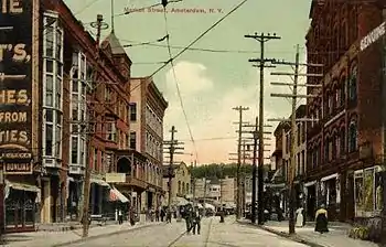 The settlement grew slowly in this period, primarily providing the services needed for the farming communities which surrounded it.[3] It was located in the now-defunct town of Caughnawaga,[4] but when the town of Amsterdam was created, the city changed its name to Amsterdam in 1803, possibly to encourage its selection as the seat of the town's government.[3]