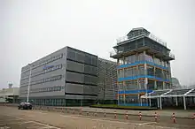The construction of a new Air Traffic Control tower was completed in 1991 as the existing tower could no longer oversee all of the airports as it was further expanded. Departure Hall 3 was added to the terminal in 1993, as was another pier, G-pier. New wayfinding signage was designed that year as well by Paul Mijksenaar.[18] A sixth runway was completed at quite some distance west of the rest of airport in 2003 and was nicknamed the Polderbaan, with the connecting taxiway crossing the A5 motorway. The distance of this runway means that taxi times to and from this runway can take between 10 and 20 minutes. It also required the construction of an additional Air Traffic Control tower as the primary tower is too far away to oversee this part of the airfield.[19]