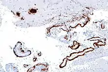 Amyloid beta can be measured semiquantitatively with immunostaining, which also allows one to determine location. Amyloid beta may be primarily vascular, as in cerebral amyloid angiopathy, or in amyloid plaques in white matter.[89]