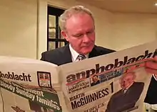 An Phoblacht (Irish pronunciation: [ənˠ ˈfˠɔbˠlˠəxt̪ˠ]; English: The Republic) was a weekly, and later monthly[1] newspaper published by Sinn Féin in Ireland. From early 2018 onwards, An Phoblacht has moved to a magazine format while remaining an online news platform. Editorially the paper took a left-wing, Irish republican position and was supportive of the Northern Ireland peace process. Along with covering Irish political and trade union issues the newspaper frequently featured interviews with celebrities, musicians, artists, intellectuals and international activists. The paper sold an average of up to 15,000 copies every week. During the 1981 Irish hunger strike its sales soared to over 70,000 per week. It was the first Irish paper to provide an edition online and currently has in excess of 100,000 website hits per week.[2]