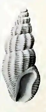 (Original description) The rather solid shell is elongate, rounded at the base and blunt at the apex. Its colour is dull white, with faint orange spots on the back of the body whorl. It contains six whorls, rounded and constricted at the sutures. The ribs are rounded and placed their breadth apart, alternate from whorl to whorl, undulate the suture, extend to the base, and number twelve on the penultimate whorl. The spirals are fine threads of uniform size and spacing, crossing both ribs and interstices, extending over the whole whorl except the fasciole area, numbering eight on the penultimate whorl and twenty on the body whorl. The wide aperture is unarmed. The varix is broad and high. The sinus is wide and shallow. The siphonal canal is a mere notch.[2]