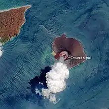 Following the December 2018 eruption, it was believed that the southwest sector of the volcano, including the summit, had collapsed during the eruption, triggering the tsunami. On 23 December, this was confirmed by satellite data and helicopter footage, with the main conduit seen erupting from underwater, producing Surtseyan-style activity.[12] The volcano lost over two-thirds of its volume due to this event,[13] and its elevation above sea level was reduced from 338 m (1,109 ft) to just 110 m (360 ft).[14][9]